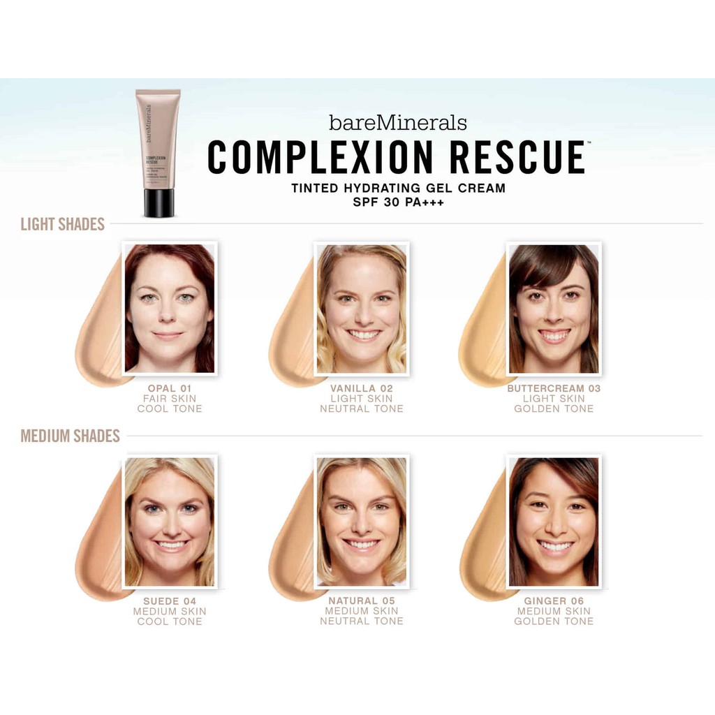I forgot to mention that complexion rescue has a non chemical mineral based broad spectrum spf 30 to prevent uv damage. With bareminerals foundation finder find the perfect shade of foundation for your skin tone. Tinted hydrating gel cream. Complexion rescue tinted hydrating gel cream bareminerals discover complexion rescue gel by bareminerals at mecca giving skin sheer to medium natural looking coverage the complexion is left with a healthy glow v 020899.