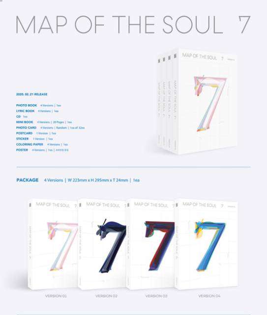 7 is the fourth korean language seventh overall studio album by south korean boy band bts the album was released on february 21 2020 by big hit entertainment it is the follow up to their 2019 extended play map of the soul. 7 bts album preorder version 1 cd official poster photo book lyric book mini book photocard postcard coloring paper sticker 5 0 out of 5 stars 2 28 27. Title bts map of the soul. 7 4 version set release date 2020 02 21 publisher.
