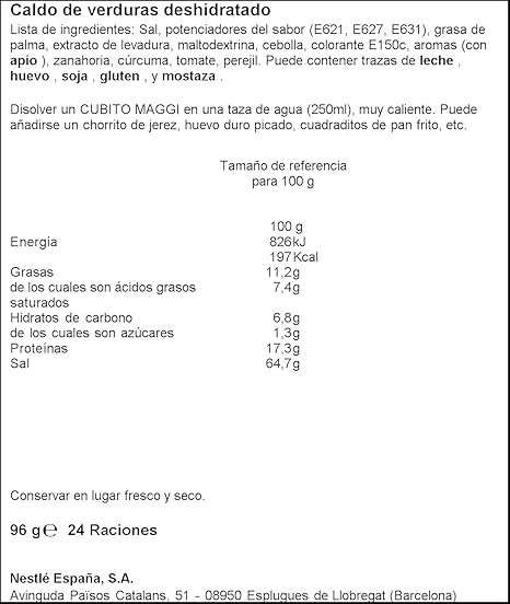 Cubito maggi ingredientes ~ Display de 60 unidades gramaje. Ingredientes sal azúcar glutamato monosódico aceite vegetal aceite de palma y aceite de palma hidrogenado almidón de maíz y menos de 2 de sabores artificiales y naturales trigo polvo de cebolla especias polvo de ajo cúrcuma puerro seco pimientos rojos secos inosinato disódico tbhq para conservar la frescura. Puede contener trazas de leche huevo soja gluten y mostaza.