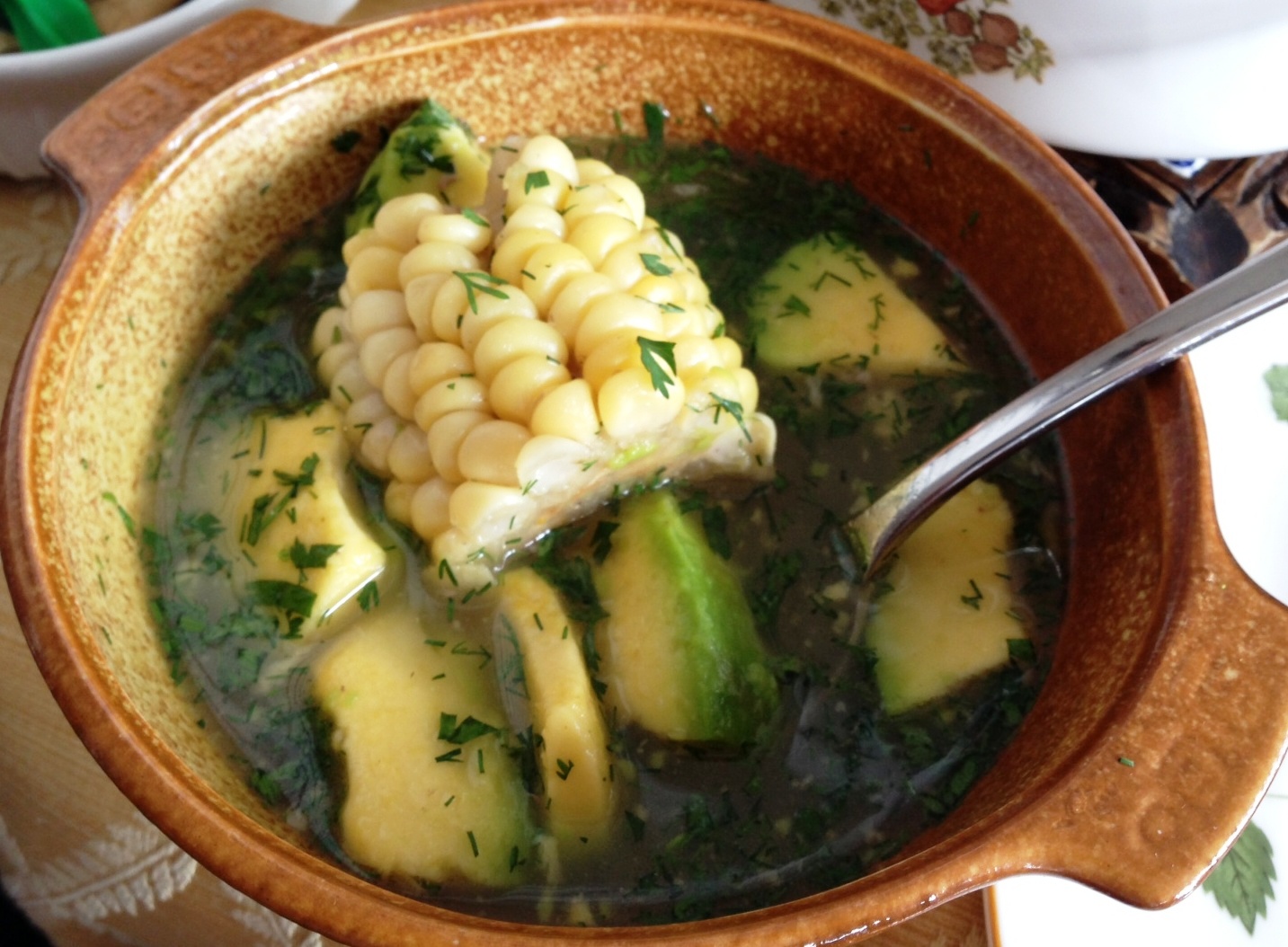 El puchero santafereño ~ Su origen se remonta a una especie de comida campesina andaluza introducida al país desde épocas de la colonia y como tal se aprovechan todos sus restos surgiendo platos derivados. It is served with hogao white rice and avocado slices. 500 gramos de carne de res.