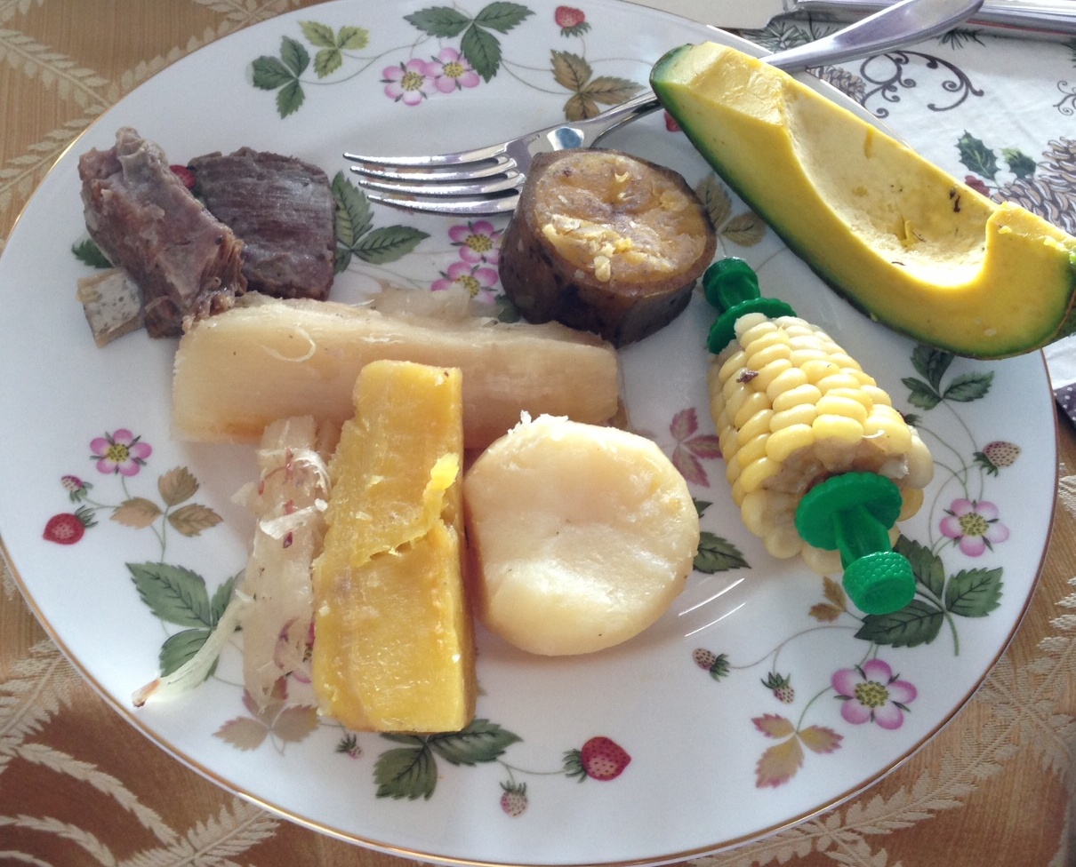 20 minutos tiempo de coccion. 1 hora y 30 minutos. This is a one pot cooked dish but at serving time the broth is served first and the vegetables and meats are served on a large plate. 2 platanos verdes.