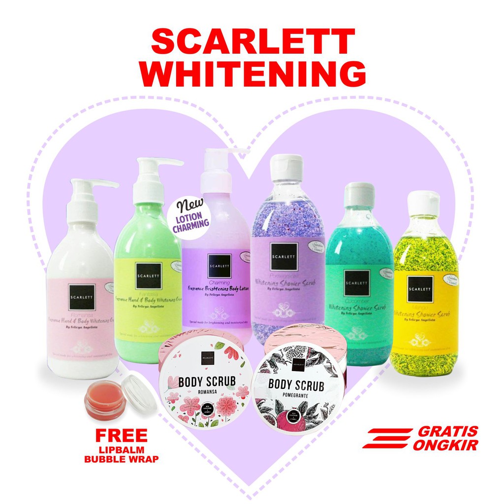 Whitening body lotion tersedia varian romansa fantasia charming mohon tulis varian yg di inginkan di catatan untuk penjual atau melalui chat tidak tulis kami kirim secara random. Senin sabtu jne jnt go send max jam 2 sore minggu tgl merah go send max jam 12 siang resi di update h 1 pengiriman ya jika ada yg ingin ditanyakan bisa langsung chat kami ya dear kami siap membantu. Scarlett whitening mengandung bahan aktif glutathione scarlett whitening adalah body lotion dan body wash pertama yang lolos uji bpom di indonesia. 4 14 yordanian sea salt shampoo scarlett.