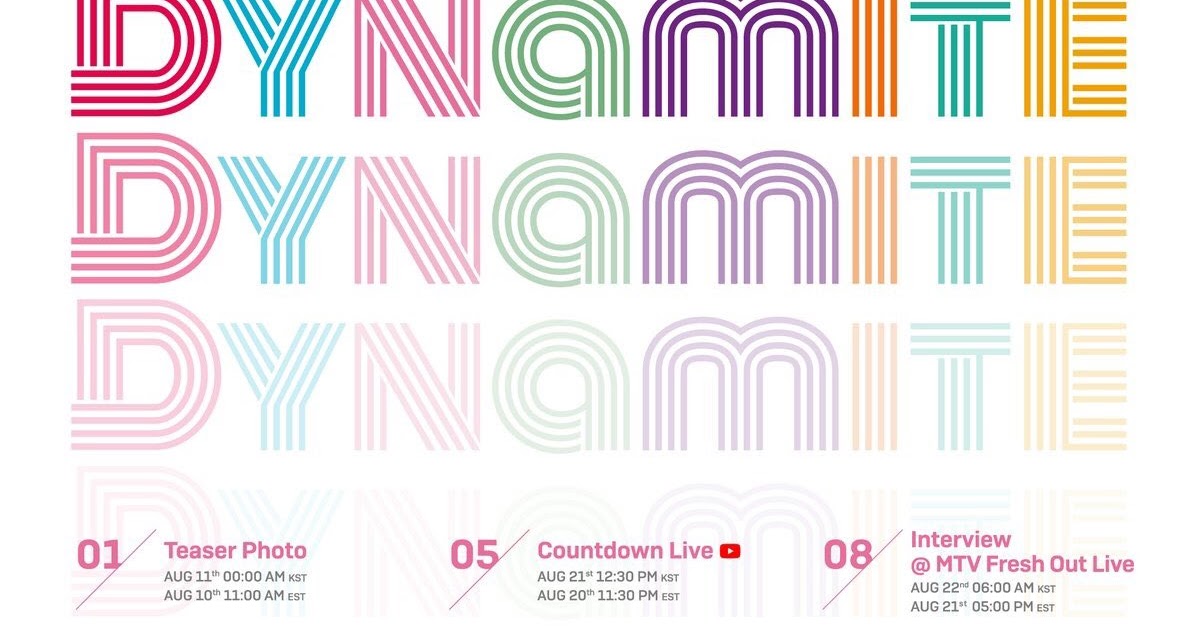 Dynamite is a song recorded by south korean boy band bts released on august 21 2020 through big hit and sony music. Choreo ver august promotion schedule a promotion schedule was been released on the aug 5 kst countdown for their dynamite promotions. In less than three weeks bts will release its eagerly anticipated new english language single dynamite ahead of the august 21 launch bts shared a promotion schedule for the project. Here s a look at bts s full promotional schedule for their upcoming single dynamite august 10 teaser photo 1 11 00 am est august 12 teaser photo 2 11 00 am est.